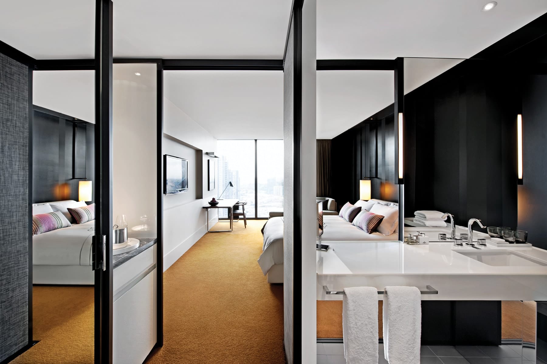 The City Luxe Room at Crown Metropol Melbourne features a custom made king bed, chaise lounge, desk, floor-to-ceiling windows, city views, fast and free internet, individual climate control, and boutique bath amenities.